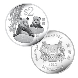 Kai Kai e Jia Jia, l'Autorità Monetaria di Singapore presenta con orgoglio la moneta commemorativa del Panda Giant 2012. La moneta presenta i due panda giganti nel loro habitat naturale.