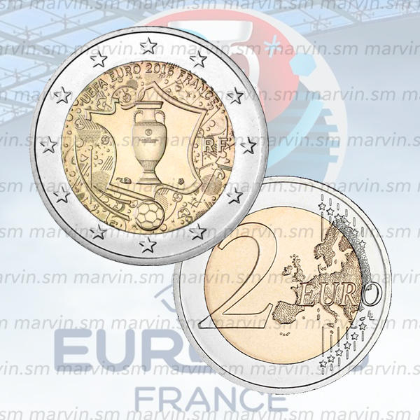 Tenuto ogni quattro anni dal 1960, il campionato europeo di calcio uomini UEFA, comunemente denominato "l'Euro", si svolse in Francia dal 10 giugno al 10 luglio 2016. L'Euro 2016, la quindicesima edizione del Campionato Europeo di Calcio, è organizzata dall'Unione delle Associazioni di Calcio Europee e riunisce le migliori squadre di calcio in Europa. Il vincitore del concorso riceve una versione su piccola scala della Coppa Henri Delaunay, nominata dall'uomo che ha inventato la gara. Il design della moneta presenta la Coppa Henri Delaunay al centro di una mappa della Francia. Sotto la mappa, un calcio si distingue in primo piano. Tutto questo è impostato su uno sfondo che presenta elementi grafici che rappresentano la competizione.