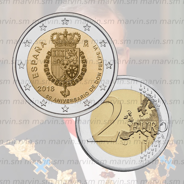 Moneta 2 euro dedicata al cinquantesimo anniversario di sua maestà il re Felipe VI, UNC.