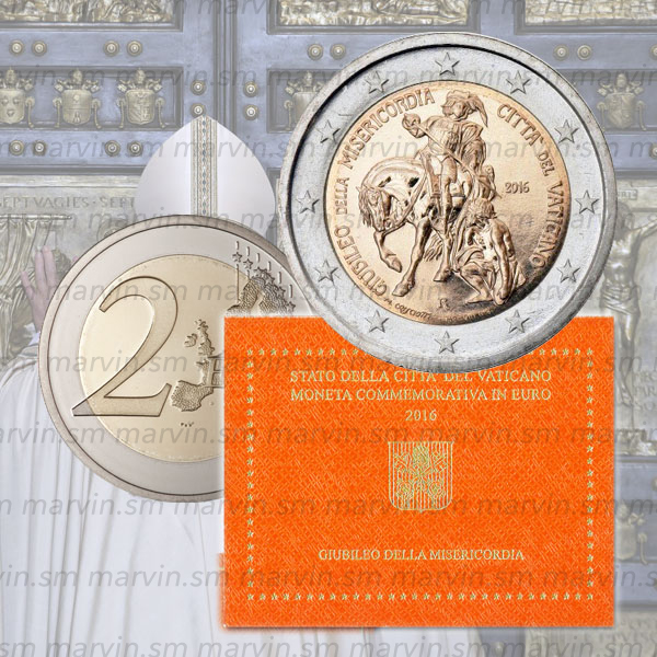 La realizzazione della moneta da 2 Euro dedicata all’Anno Santo della Misericordia è stata affidata a Mariangela Crisciotti e rappresenta San Martino de Tours, soldato della guardia imperiale romana, mentre in sella al suo cavallo taglia con la spada il mantello per darlo a un povero seminudo e infreddolito incontrato lungo il cammino. La rappresentazione si riallaccia all’iconografia classica ed è sicuramente esemplificativa di una delle sette opere di misericordia – vestire gli ignudi – rievocando le parole di Gesù: «ero nudo e mi avete vestito». Secondo la tradizione la notte seguente a tale episodio Gesù apparve in sogno a San Martino nelle sembianze di un povero e mostrandogli il mantello disse: «Martino ancor catecumeno m’ha coperto con questo mantello». Al risveglio, trovando il mantello miracolosamente intatto, San Martino decise di farsi battezzare e di continuare a militare solo sotto la bandiera di Cristo.