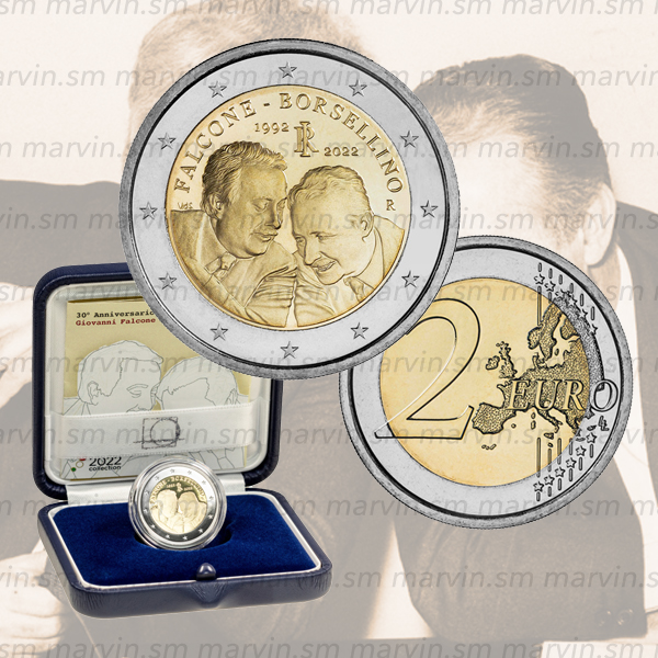 Moneta commemorativa da 2 euro in Box Ufficiale dedicata al 30° anniversario della scomparsa di Giovanni Falcone e Paolo Borsellino, Fondo Specchio.