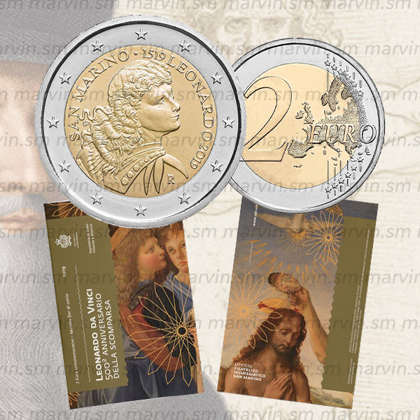 Leonardo di ser Piero da Vinci è stato un uomo d'ingegno e talento universale del Rinascimento che incarnò in pieno lo spirito della sua epoca, portandolo alle maggiori forme di espressione nei più disparati campi dell'arte e della conoscenza. Si occupò di architettura e scultura fino a scenografia, musica e anatomia. È considerato uno dei più grandi geni dell'umanità. La moneta raffigura un particolare dell'opera "Il Battesimo di Cristo" di Andrea del Verrocchio, Leonardo da Vinci e altri pittori di bottega, databile tra il 1475 ed il 1478 e conservato nella Galleria degli Uffizi a Firenze. Il maestro Verrocchio impostò la composizione e dipinse in parte le due figure principali del Cristo e del Battista, con il suo stile lineare e nervoso derivato dalla specializzazione nell'oreficeria. In un secondo momento vennero coinvolti altri due collaboratori. Solo in una terza fase, quella finale, venne chiesto a Leonardo da Vinci, allievo del Verrocchio, di ultimare il dipinto cercando di uniformare le parti già dipinte. A lui spetta il dolce volto dell'angelo di profilo (raffigurato sulla moneta), dove si nota il suo caratteristico stile sfumato, ma anche le velature trasparenti a olio che unificarono i piani del paesaggio in profondità e addolcirono il corpo del Cristo.