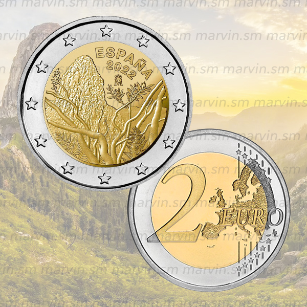 Moneta 2 euro dedicata al Parco Nazionale di Garajonay, parte del Patrimonio Mondiale dell'UNESCO, UNC.