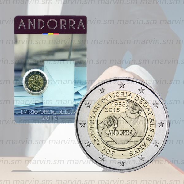 Il disegno riproduce l'immagine parziale di un o una giovane nell'atto di depositare il voto nell'urna. La scheda elettorale reca l'iscrizione «ANDORRA». A sinistra dell'immagine sono iscritti gli anni interessati dalla ricorrenza: 1985 e 2015 (quest'ultimo è anche l'anno di emissione della moneta). Il disegno è circondato da una banda in cui è iscritto in forma abbreviata l'oggetto della celebrazione: «30è ANIVERSARI MAJORIA D'EDAT ALS 18 ANYS» (30º anniversario dell'attribuzione della maggiore età e del conferimento dei diritti politici agli uomini e alle donne al compimento del diciottesimo anno). Sull'anello esterno della moneta figurano le 12 stelle della bandiera dell'Unione europea.