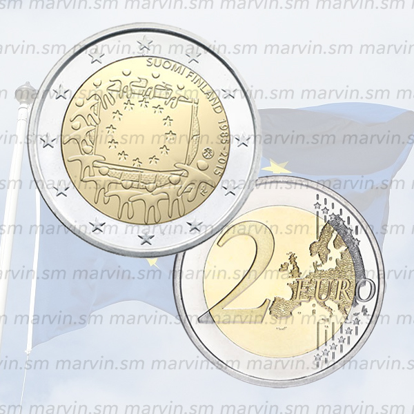Moneta 2 euro dedicata al 30° anniversario della bandiera dell'Unione Europea.