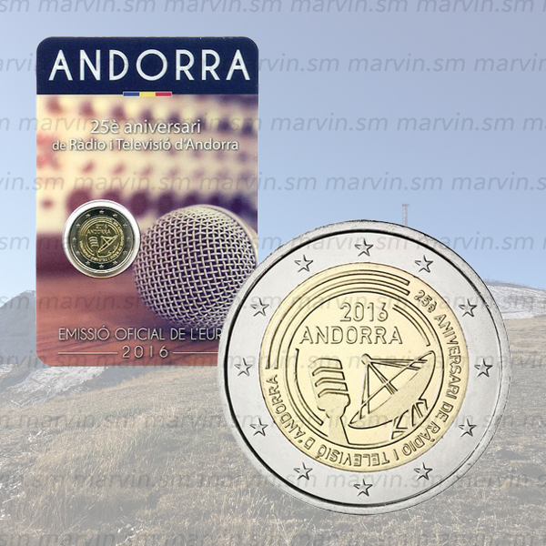 Questa moneta commemorativa celebra il 25° anniversario della creazione dei mezzi d’informazione pubblici ad Andorra con l’inizio delle trasmissioni della radio e della televisione pubbliche andorrane. Il disegno raffigura un microfono e un’antenna circondati da varie linee concentriche con la dicitura "25è ANIVERSARI DE RÀDIO I TELEVISIÓ D’ANDORRA".