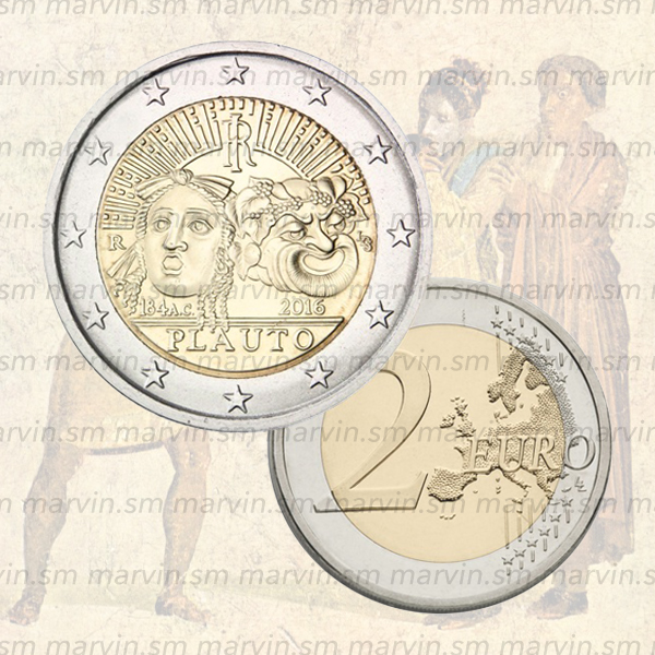 Moneta 2 euro commemorative dedicate al 2200° anniversario della morte di Tito Maccio Plauto, fior di conio. Tito Maccio Plauto nacque a Sàrsina tra il 255 e il 250 a.C. e morì a Roma nel 184 a.C. Forse partecipò alla guerra contro i Galli Boi e Insubri (che finì con la vittoria di Claudio Marcello nel 222 a.C.) e forse in questa circostanza egli abbandonò la città natale e si trasferì a Roma. Il nome “Maccius” rimanderebbe anche a una sua attività come attore delle Atellane nei primi anni a Roma. Tito Maccio Plauto scrive solo "Palliate", traduce e riadatta i copioni attici della commedia nuova.