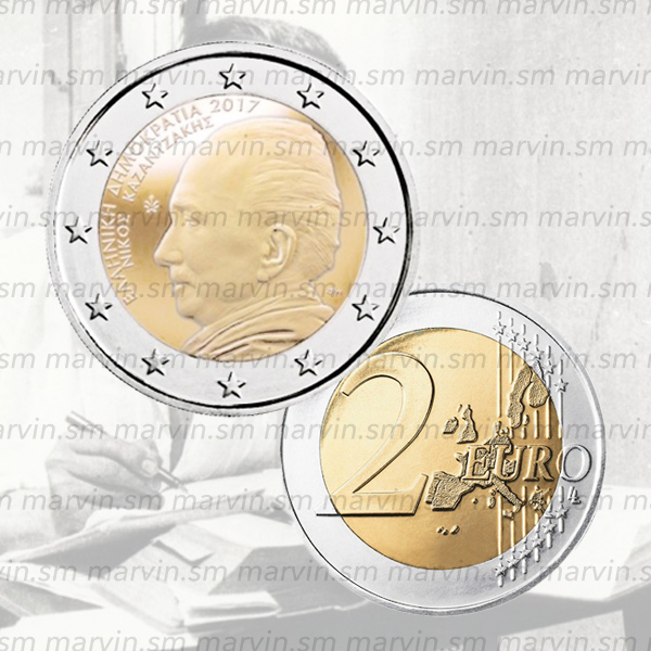 Sul dritto della moneta è raffigurato di profilo Nikos Kazantzakis, uno dei più grandi greci scrittori del XX secolo. A sinistra lungo la circonferenza del cerchio interno figurano, in greco, le diciture corrispondenti a "REPUBBLICA ELLENICA" e "NIKOS KAZANTZAKIS". Completano le iscrizioni la anno di emissione "2017", in alto, e una palmetta (marchio della zecca greca), a destra. In basso a destra è visibile il monogramma dell'artista (George Stamatopoulos). Sull'esterno della moneta figurano le 12 stelle della bandiera dell'Unione europea.