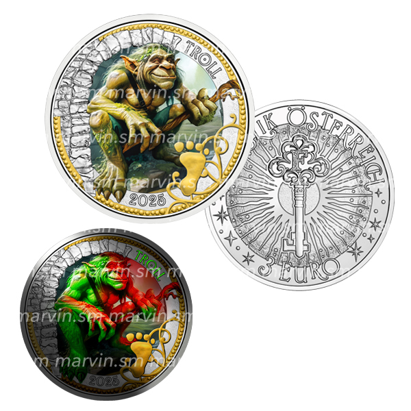 Moneta 3 euro dedicata al Troll, fior di conio.