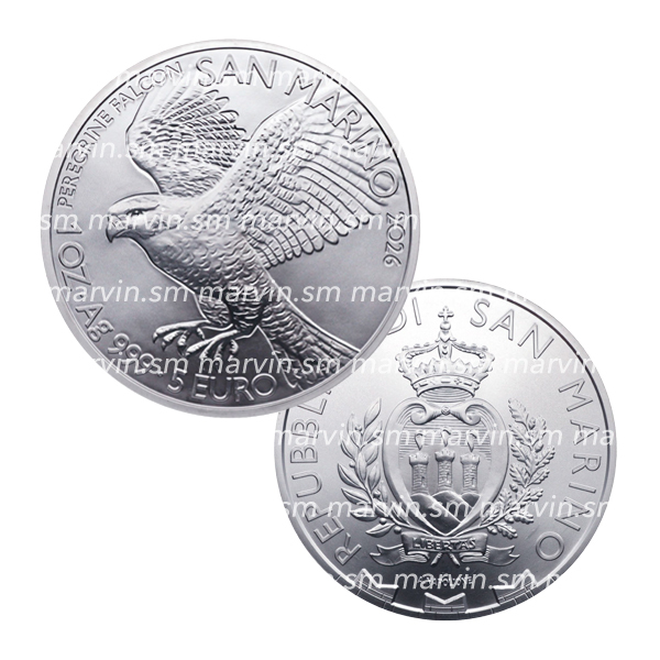 Moneta in Argento da 5 euro dedicata all'emblema di San Marino, il falco pellegrino, FDC.