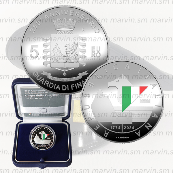 5 euro in Argento in Box dedicata al 250º anniversario della fondazione del Corpo della Guardia di Finanza, Fondo Specchio.